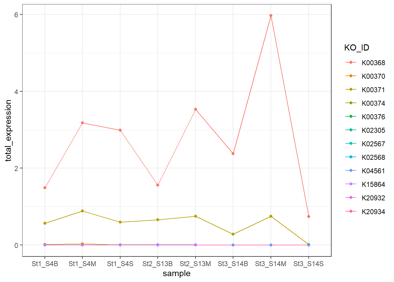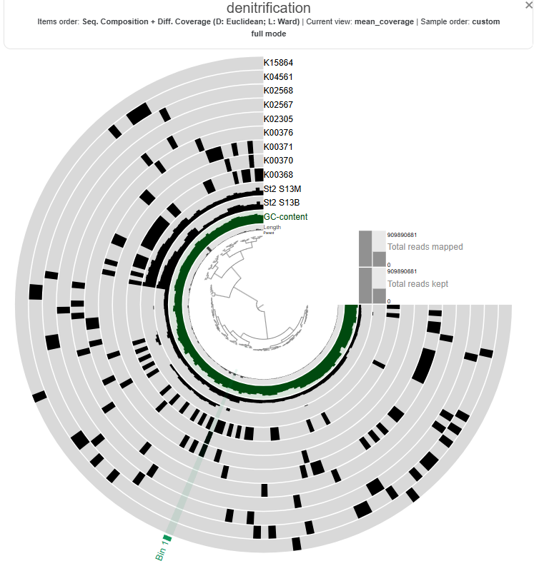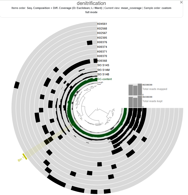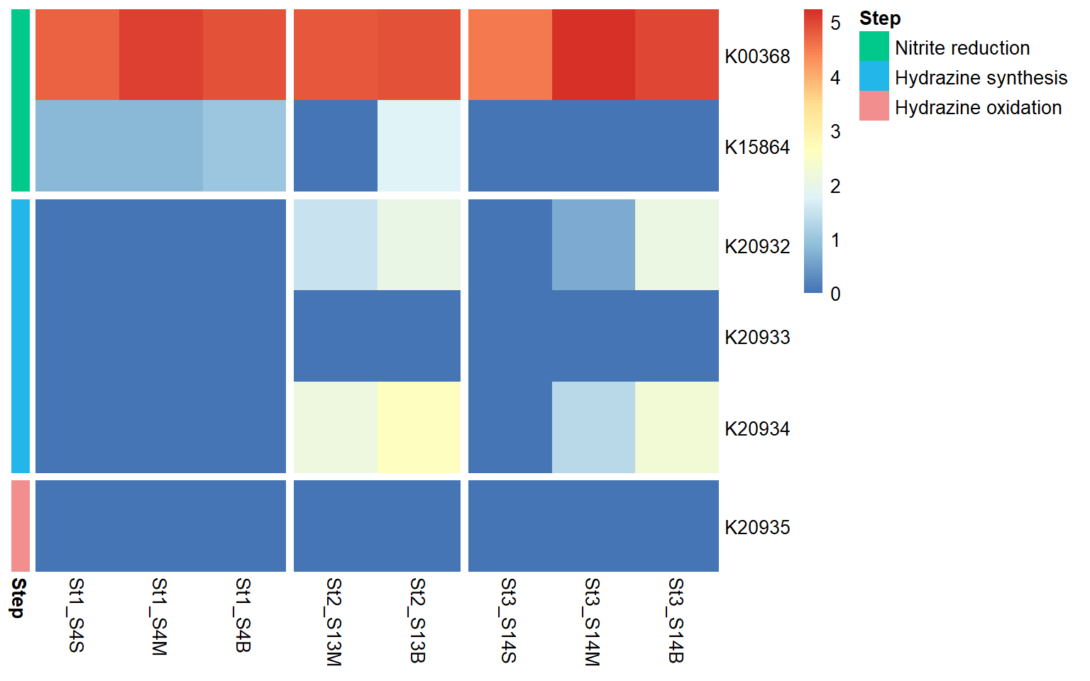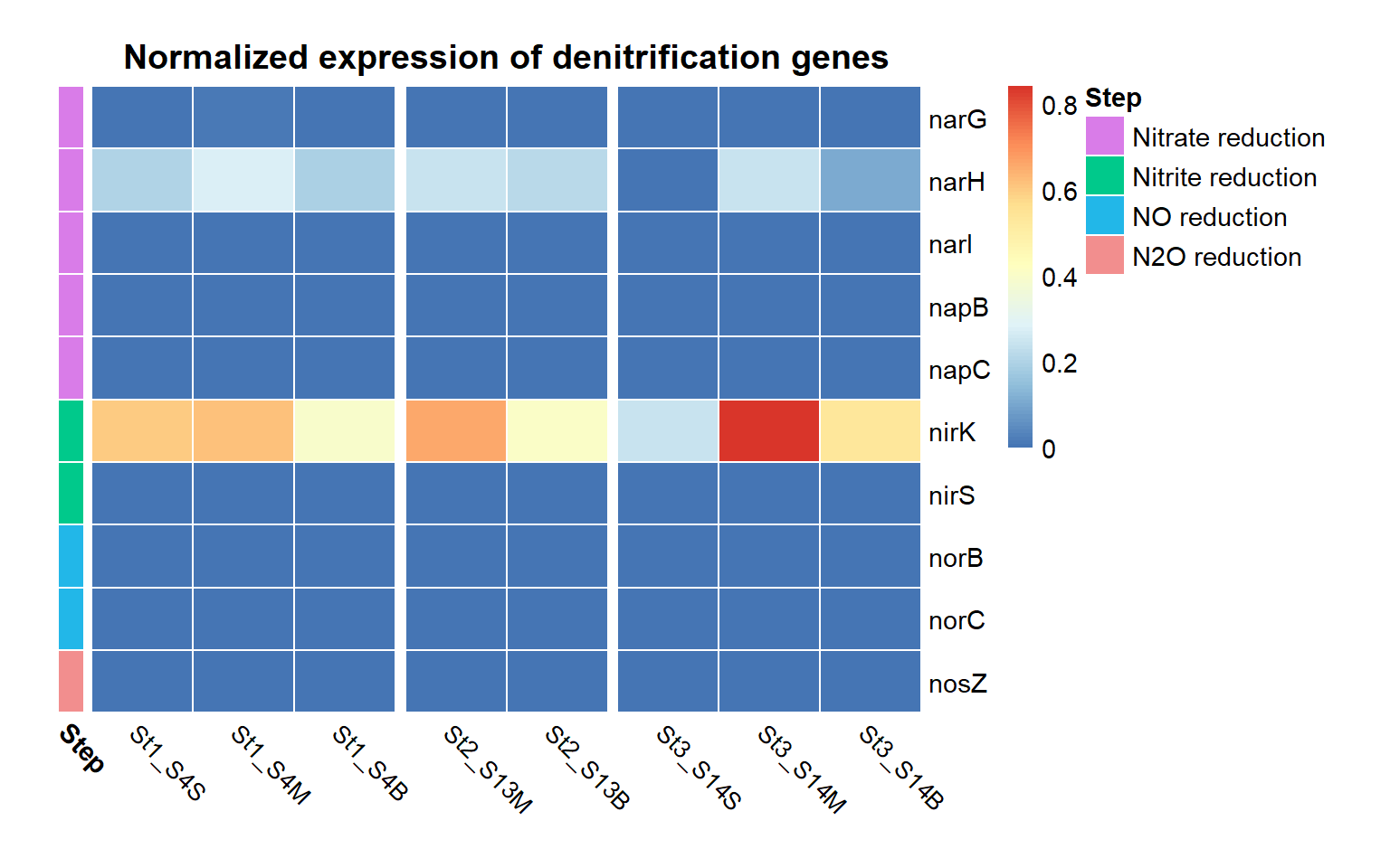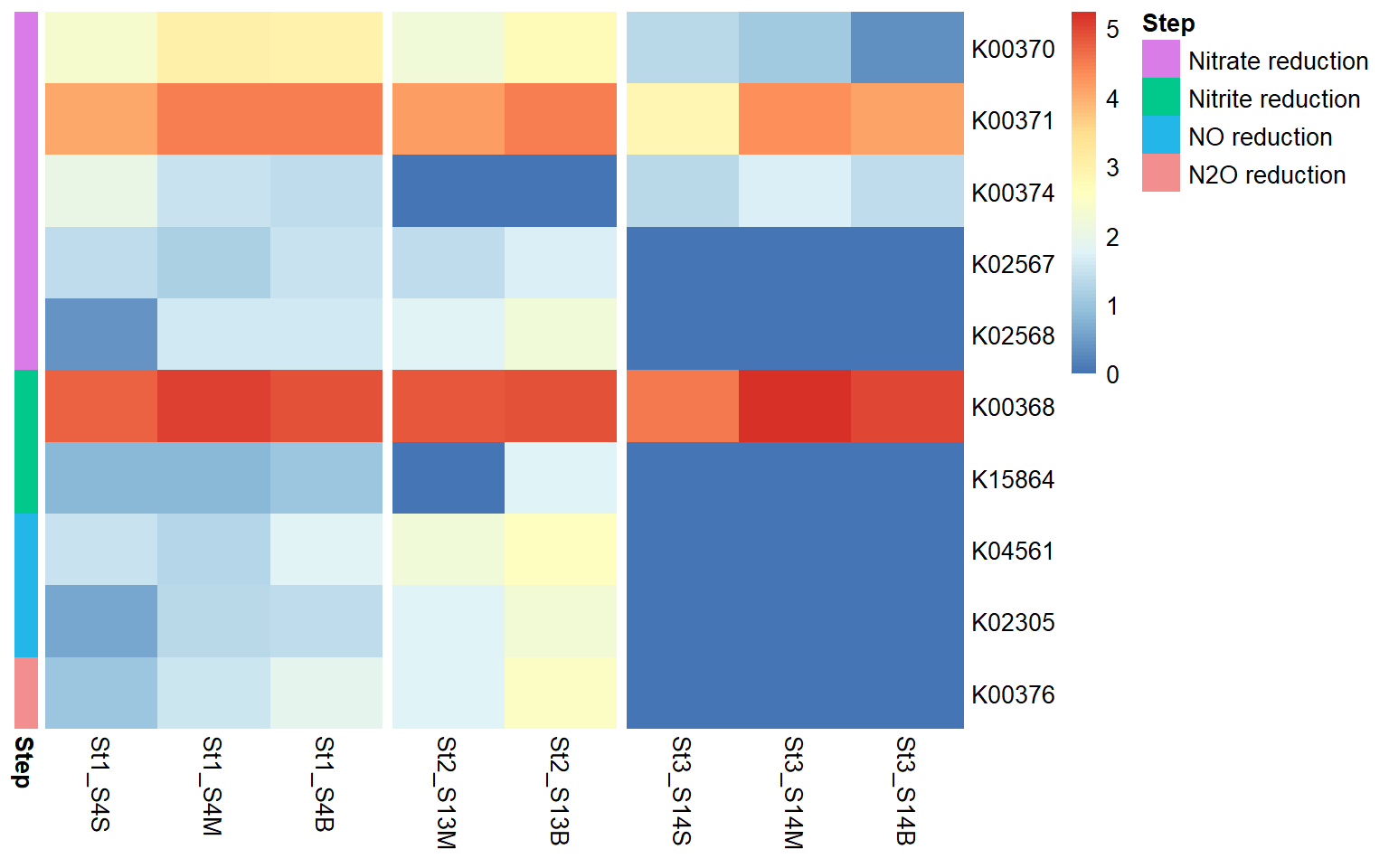 Genes associated with the reduction of nitrite to nitric oxide are represented by K00368 (nirK) and K15864 (nirS), which encode alternative nitrite reductases (the presence of only one transcript is enough). The gene of nirK exhibits the highest coverage across samples, indicating that the conversion of nitrite to nitric oxide may represent a dominant step in the denitrification pathway in these samples. In contrast, nirS shows considerably lower expression, suggesting a predominance of nirK-type denitrifiers in the active microbial assemblages.