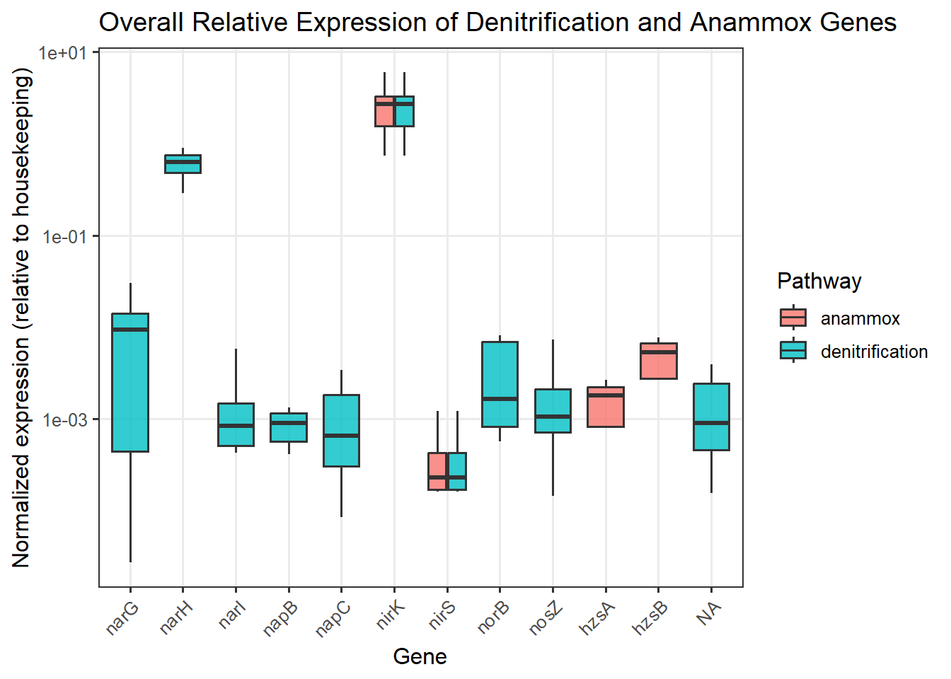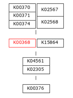 The first step of denitrification, the reduction of nitrate to nitrite, can be catalyzed by two distinct enzymatic systems: the membrane-bound nitrate reductase (Nar) and the periplasmic nitrate reductase (Nap). In this dataset, the Nar pathway is represented by K00370, K00371, and K00374, while the Nap pathway is represented by K02567 and K02568 (see pathway diagram above).
