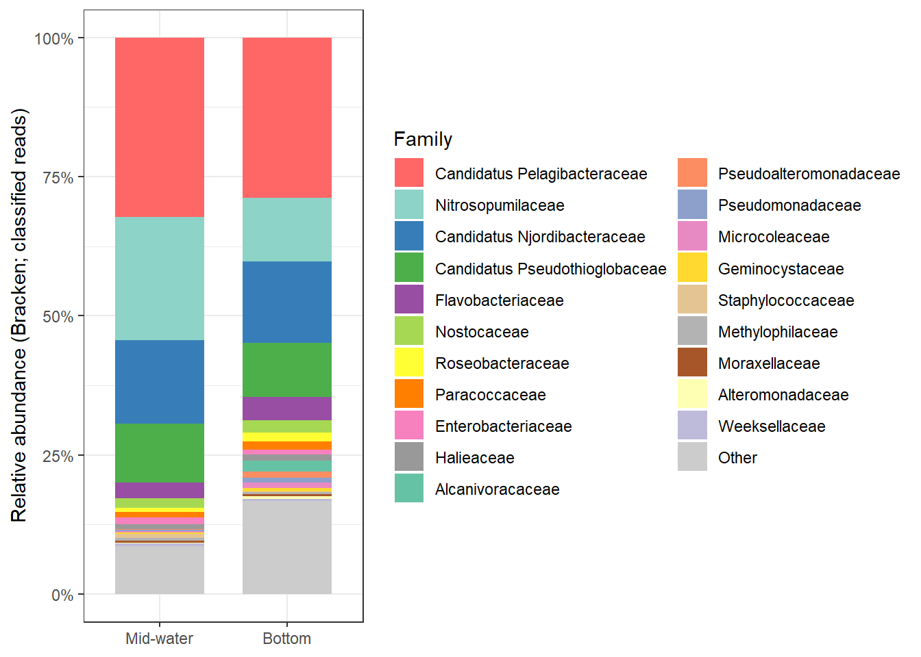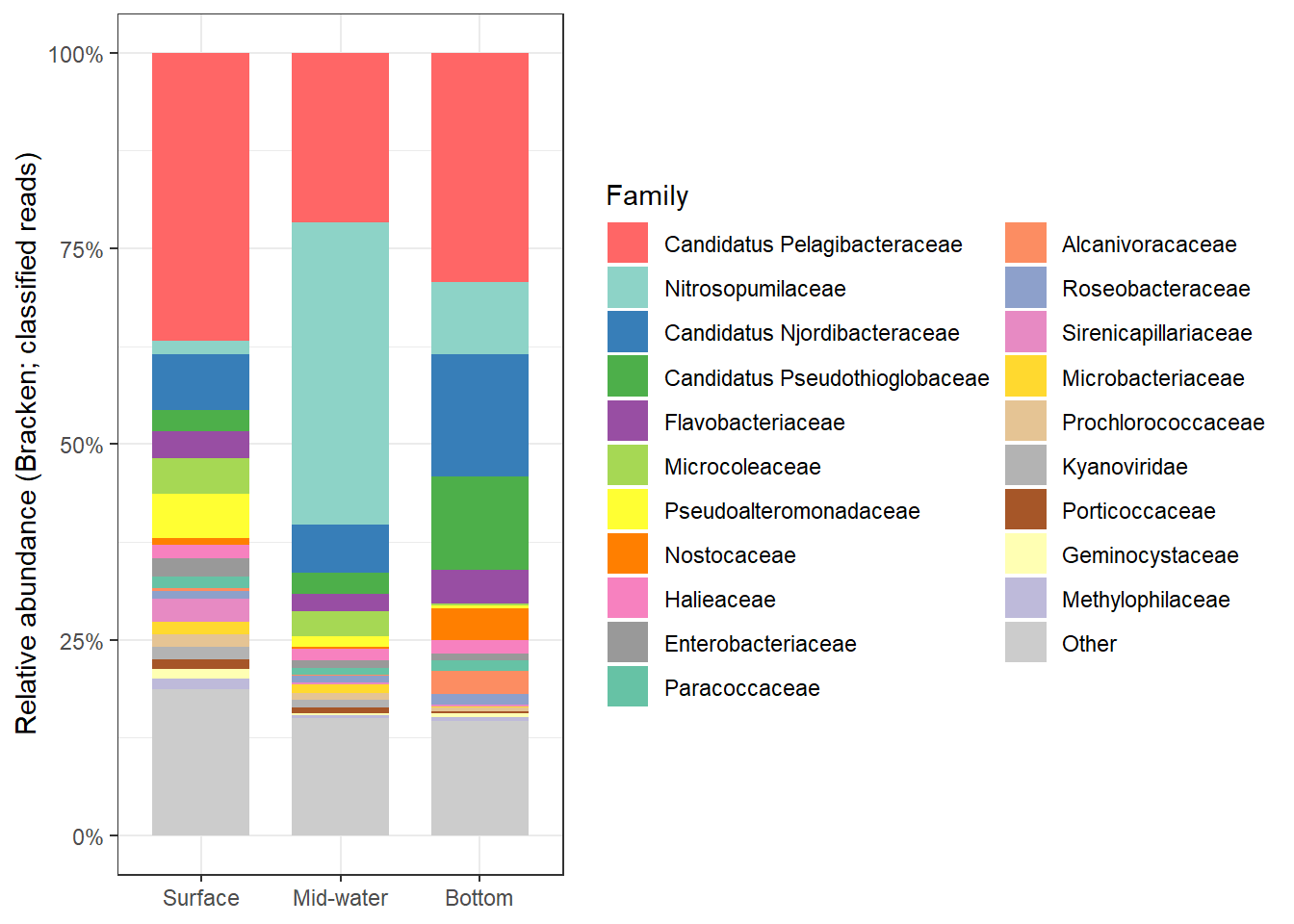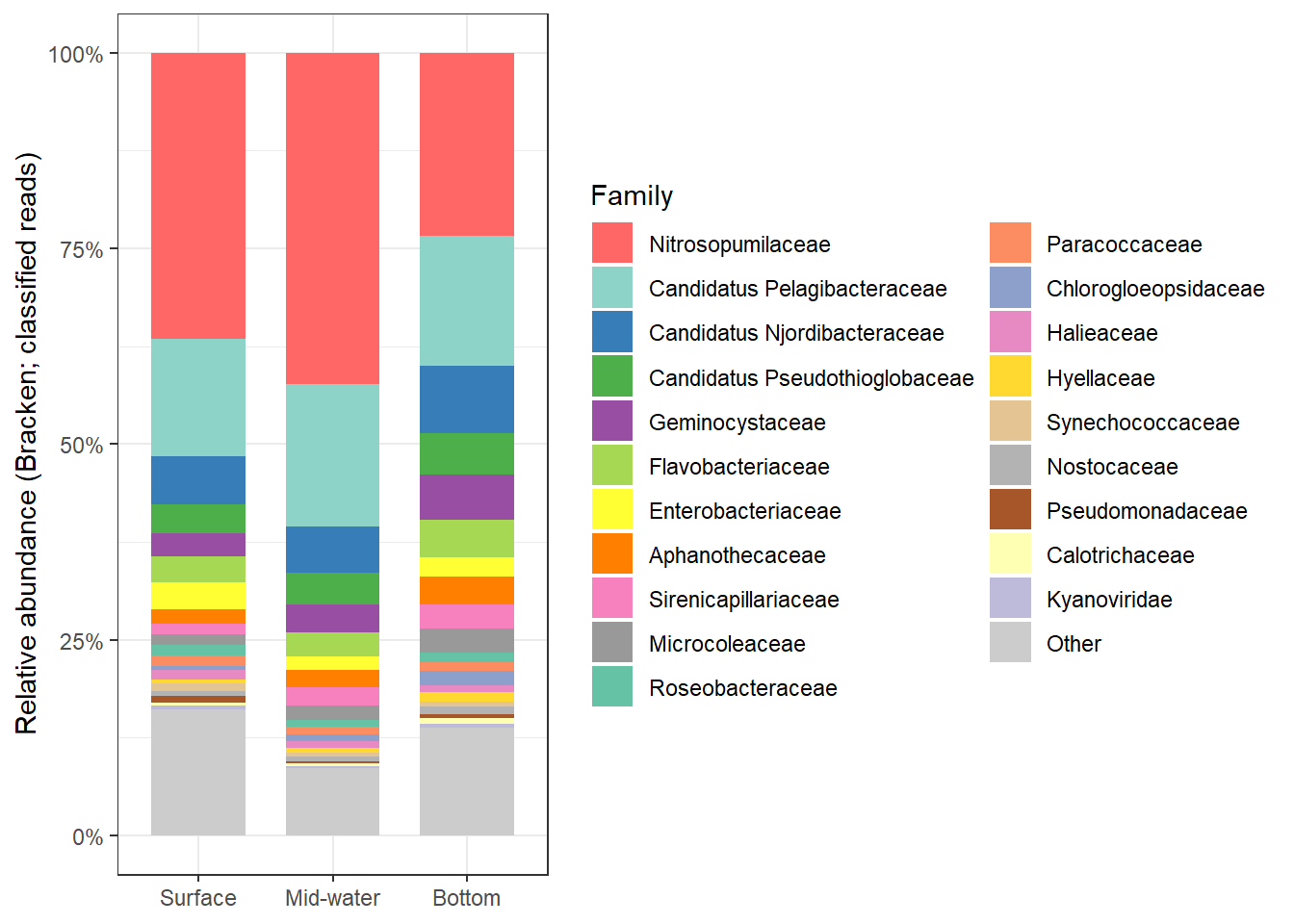 Across Stations 1 and 2, several denitrification genes exhibit higher transcript levels in mid-water and bottom samples compared to surface waters, suggesting that denitrification activity may be enhanced in deeper parts of the water column.